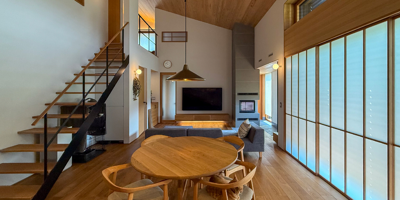 - 板張り天井の大きな吹き抜けとリビング階段
